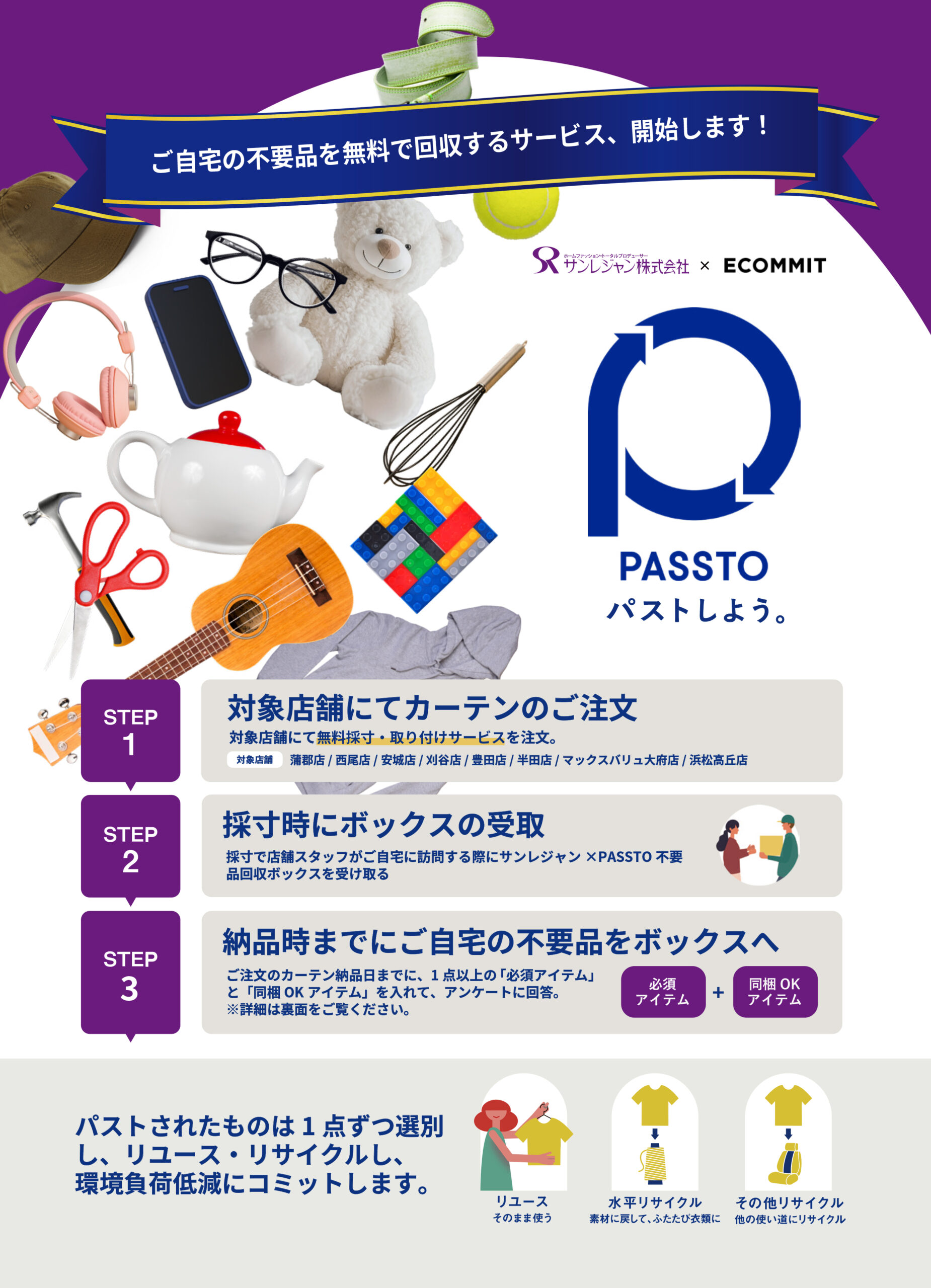 本事業は、サンローズグループ・カーテン専門店サンレジャンが展開するオーダーカーテン販売における自宅訪問型サービスを活用し、家庭内の不要品を効率的にリユースにつなげる新たな循環モデルの実証実験となります。