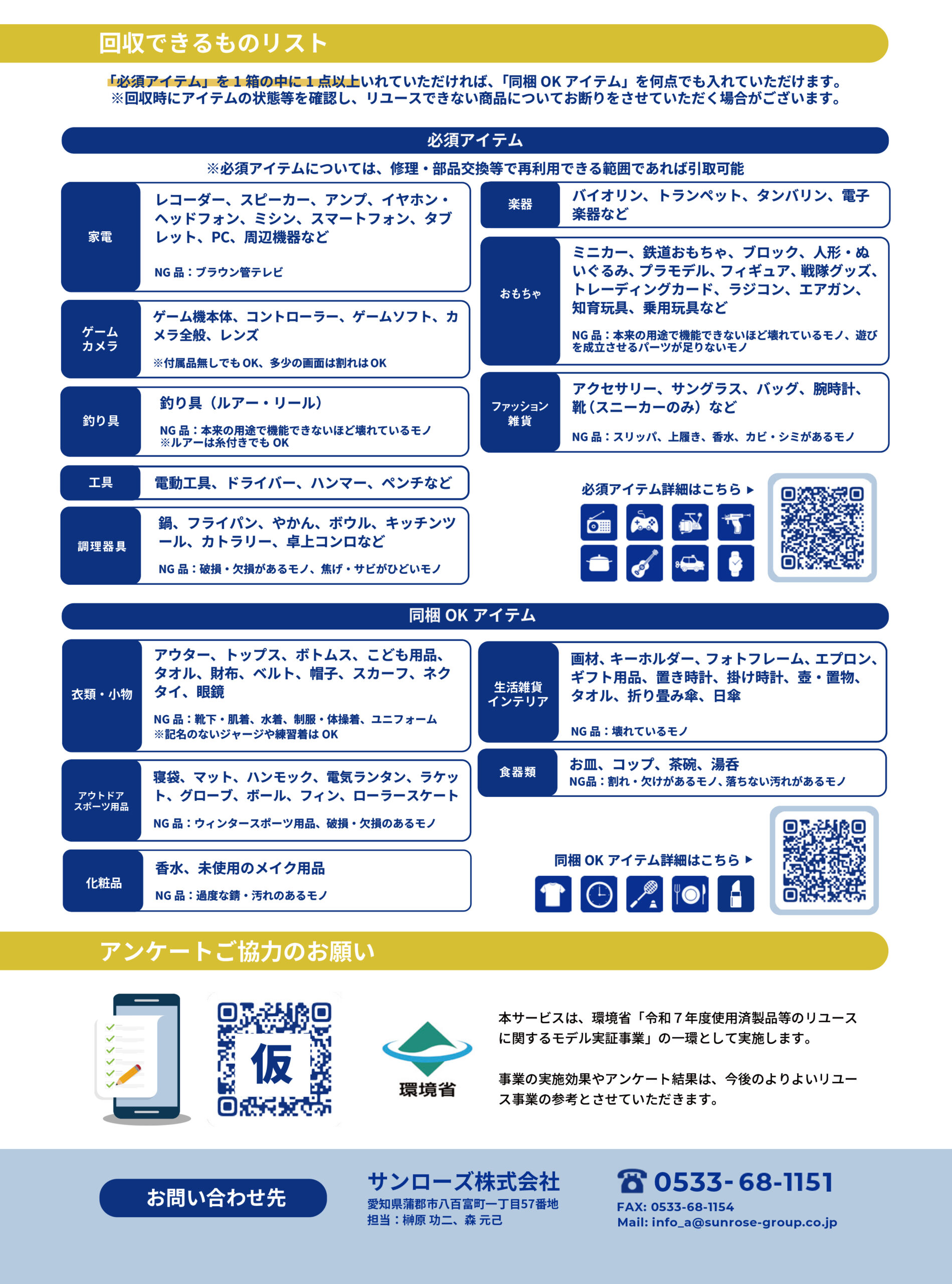 リユース対象は小型家電、アクセサリー、調理器具などの「必須アイテム」と、衣類や生活雑貨などの「同梱可能アイテム」とし、回収物の有価性と経済性を担保する予定です。